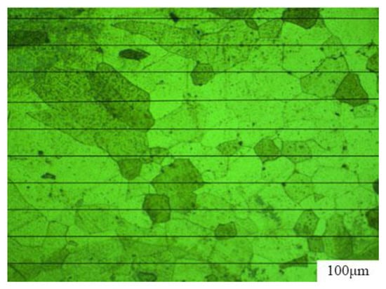The intercept method shown in Figure 8 was used to calculate grain sizes in the HAZ. Ten parallel lines of equal length were drawn on a metallographic image and the average grain size of the HAZ was calculated by determining the number of grains intersecting each parallel line, using the image scale as a reference. The grain size of the HAZ was thus measured and grain sizes of ten lines were averaged to limit the error. The grain sizes of the HAZ in the metallographic image were analyzed with Image-Pro Plus 6.0 software. According to ASTM E112 [], the average grain size of the HAZ was Grade 5 to 6.