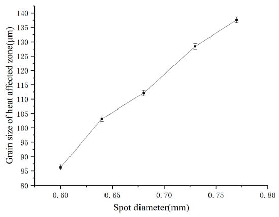 The welding thermal cycle included two stages where the temperature rose and fell during welding, during which the HAZ of the weld was prone to thermal pinning. There is a large temperature gradient in the HAZ during an actual welding process, i.e., large undercooling causes different parts of the same grain to experience a different temperature. Grains near the fusion line also experience different temperature gradients within the grain; therefore, the grain size near the fusion line was larger than that far from the fusion line in the HAZ. The HAZ grain size increased with a slower cooling rate, because of the wider weld width attributed to the larger spot diameters, as shown in Figure 9.