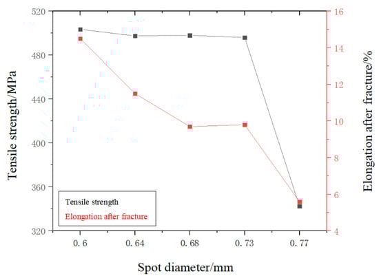 Figure 10 shows the change curves of tensile strength and elongation of welded joints with different spot diameters after fracture. However, the temperature gradient and heat transfer mode of the welding pool did not change significantly, which determined that the orientation of the columnar crystal and the distribution of low-melting point material in the center of the weld were similar, so the strength of the welded joint did not change much when the beam diameter was 0.6–0.73 mm. In Figure 10, the tensile strength of the welded joint generally showed a downward trend with increasing spot diameter, and the maximum tensile strength of the welded joint reached 503.5 MPa when the laser spot diameter was 0.6 mm. When the spot diameter was 0.77 mm, the tensile strength of the welded joint was 342.5 MPa. At the same time, the elongation after fracture of the welded joints also decreased with increased spot diameter. This was shown again in Figure 11. When the spot was 0.6 mm, the elongation rate of the welded joint after fracture approached 14.5%.