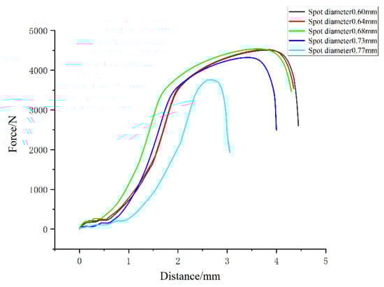 The static load tensile test on welded joints was performed with different spot diameters. Each group of spot diameters used two samples, and the results were averages of the two samples, as shown in Table 4.