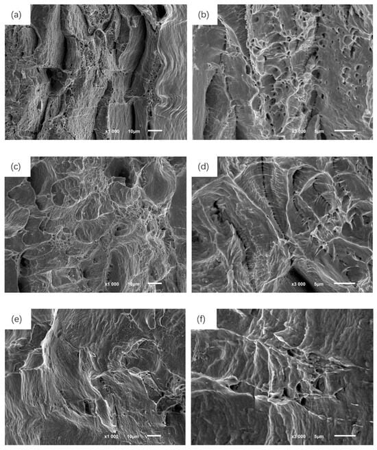 The results of scanning electron microscopy analysis of the tensile fracture of welded joints were shown in Figure 13. In Figure 13a,b, the tensile fracture was accompanied by multiple fracture pits of greater depth. The dense, small equiaxial dimples remain at the top of the overlapping crests. These dimples were small in area but evenly distributed, and mainly formed under normal stress in three spatial directions. Some small dimples were attached to the inside of the large dimples, showing the equiaxial characteristic. The small and large dimples combined freely to form the fracture morphology []. With the combination of dimples and the increase in area and depth, the elongation and overall plasticity of A4-1 welded joint specimens after fracture were enhanced significantly. The fracture morphology in Figure 13c–e was more inclined to dissociation characteristics, and the dimples aggregation behavior gradually disappeared, belonging to the brittle fracture mode. The pattern of river and fan as well as accumulation of delamination cracks were clearly observed in the specimen fracture []. When the weld samples of A4-4 and A4-5 were subjected to tensile action and overload fracture occurs, the ferritic structure crack mostly at the grain boundary and developed rapidly along the direction of load action, forming a lateral delamination structure. In Figure 13f, the parallel step-like river branching patterns were also captured in the fracture image, which further determined the brittle fracture characteristics of sample A4-5. Dislocation accumulation in the cross section blocked the intersection of the sliding surface, resulting in twin accumulation at the grain boundary to produce a large stress concentration phenomenon. In addition, the increase in the spot diameter made the center of the weld extend the coarse columnar crystal structure, and the residual stress after welding was difficult to release through plastic deformation, resulting in the rapid formation of the initial crack on the surface of the dissociation. The crack propagation speed inside the metal matrix was also accelerated, and finally the tensile strength and elongation decreased significantly.