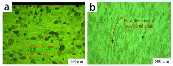 The tubular part welded with a 0.60 mm spot diameter was subjected to axial tangential stress, radial compressive stress, and tangential circumferential stress during spinning. As shown in Figure 15b, the base material and weld grains formed a flow dynamic under the combined action of these forces. The welded part underwent large plastic deformation during spinning. Figure 16b shows that the equiaxed grains and columnar crystals in the weld center broke under the action of the spinning pressure of the roller, and broken ferritic grains rearranged along the spinning direction. With continuous spinning pressure [], the ferritic grains that had been broken into fine particles were uniformly distributed within the FSS. The continuous action of the spinning roller gradually caused a force in the direction of the wall thickness of the welded tubular parts to become uniform, and plastic deformation also became uniform. When the plastic deformation reached a specific level, internal dislocations of FSS increased sharply, increasing the dislocation density and forming smaller sub-crystals where ferritic grain recrystallization occurred []. Therefore, during spinning, the welded tubular parts generated fine ferritic deformation grains and several recrystallized grains.
