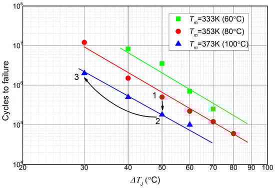 Due to the mismatch of coefficients of thermal expansion of the various material layers typically used in devices and other packages, the bond wires and the solder layers subjected to thermomechanical stresses cause bond wire degradation and solder joint fatigue, i.e., thermal damage. Power devices fail when thermal damage surpasses the threshold. Moreover, as a matter of fact, has a greater impact on the device failure than . From Figure 1, it can be concluded that, if is reduced by the same amount that is increased by, a much higher number of cycles to failure can be achieved. Unfortunately, is not taken into consideration in temperature monitoring approaches. Consequently, the device is only able to “safely” operate continuously at the maximum allowable temperature, while the potentially damaging stresses due to in the module cannot be avoided.