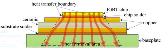The IGBT chip, acting as the heat source, contributes to the entire heat inside the device. The heat is generated in the chip and spreads through several layers with different materials down to the baseplate, constituting the thermal path of the device, as illustrated in Figure 3. Most of the heat spreads down along an angle of 45°, regarded as the optimal thermal path. This thermal path can be described by the transient thermal impedance from the junction to ambient , which is shown as follows:
