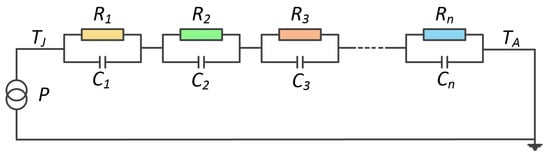 The function of can be described by an electrical equivalent resistance-capacitance () network, shown in Figure 4, which is known as the Foster network. A series of exponential terms is used to characterize the time response of the Foster network as follows: