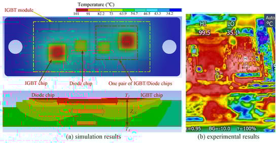 where P denotes the total power losses of the module, denotes the conduction power loss, denotes the switching power loss, is the collector current, is the on-state collector-emitter voltage, and represent the turn-on and turn-off energy of the module, respectively, and is the switching frequency. Based on the operation conditions in Table 1, the power losses of the module are estimated by (8). (c) The thermal analysis is processed in ANSYS under a transient mode for 10 s and the sampling interval is 0.001 s. Placing the power losses on the IGBT chips, the results of the thermal analysis for the IGBT module are obtained, as shown in Figure 6. At the same time, we set up the thermal analysis experiment platform. In the experiment, the IGBT module proceeded with the same operating conditions as the simulation, and the temperature distribution map of the upper surface of the device was obtained by an infrared camera, as shown in Figure 6. From Figure 6, we can see that the temperature distribution results of the simulation and experiment are consistent. The slight temperature difference may be caused by the difference in heat dissipation conditions.