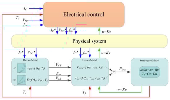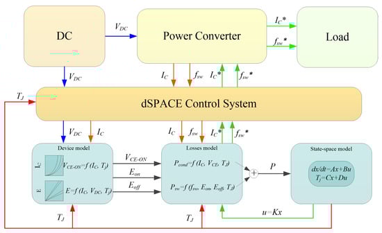 In the control scheme, the switching frequency , load current , and DC-link voltage are collected by the physical system. In addition, the device’s electrical characteristics are taken into account to identify the voltage and the switching energies and . These electrical parameters are used to calculate module’s power losses, P, which are presented to the state-space model to estimate the module’s temperature. The feedback controller is utilized to precisely regulate the electrical variables according to the set value of and . In this section, the electrical variables, including and , are set to be constant to simplify the control complexity, while the switching frequency is selected as the only variable to regulate the power loss for temperature control.