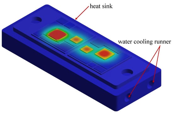 The design of the simulation analysis is performed as follows to eliminate the influence of various operation conditions: (a) The heat sink is water-cooling, and the water-cooling runners are inside the heat sink, as shown in Figure 9. The heat sink material is aluminum, and the water-cooling runners keep the heat sink temperature constant at 25 °C; (b) the DC-link voltage is 100 V, and the load current is sinusoidal current, as shown in Figure 10; (c) the basic value of the switching frequency is 10 kHz, while it can vary from 5 kHz to 20 kHz; (d) the converter modulation frequency is 10 Hz; (e) the simulation analysis is processed in ANSYS under a transient mode for 10 s. The results of the simulation test are described next.