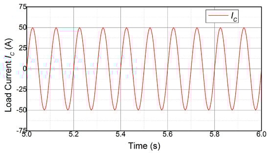 Adopting the control strategy in the simulation section, the switching frequency is selected as the only variable to regulate the module’s power losses in order to precisely control the junction temperature, and the test conditions are set as follows: (a) the heat sink is cooled by forced-air convection, and the temperature of the bottom surface keeps constant at 25 °C; (b) the DC-link voltage is constant, and the test current is sinusoidal current, shown in Figure 8; (c) the basic value of switching frequency is 10 kHz, while it can change from 5 kHz to 20 kHz; (d) the experimental analysis is processed in a transient mode for 300 s. The results of the experimental test are described next.