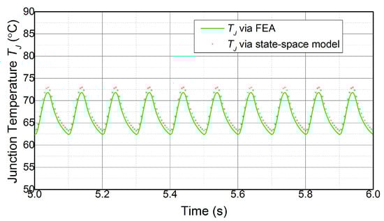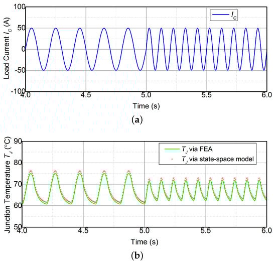 Firstly, the effectiveness of the state-space model, which is to achieve a temperature estimate according to the power losses of the device, is demonstrated. The power module used in this section is shown in Figure 2, and the power losses are calculated with (8). The state-space model, which is composed of (6) and (7) with the parameters in Table 1, estimates the temperature on the basis of currents, shown in Figure 10. Meanwhile, the FEA of the power module is processed in ANSYS to acquire the temperature according to the same load currents. The junction temperature estimated by the state-space model is compared with the results from FEA, which is shown in Figure 11.