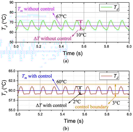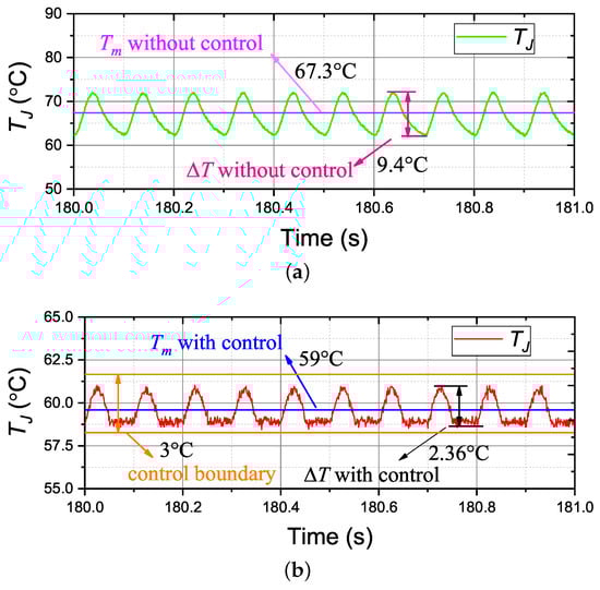 The test of the designed controller during various operation conditions has been performed experimentally. The test load condition profiles are based on the currents shown in Figure 10. The test temperature results with and without control are shown in Figure 16. Compared to the temperature results without control, the designed controller is competent at reducing the module’s thermal cycling due to the variations of current profiles. The values of and are illustrated in Table 3.