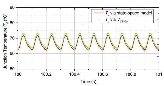 Firstly, the effectiveness of the state-space model, which is proposed to estimate the junction temperature, is demonstrated. As described in Section 2.2, the parameters of R and C have been obtained using the FEA method and are shown in Table 1. The electrical variables, including , , and , are collected and utilized to calculate the power loss of the module according to (8). The state-space model, which is composed of (6) and (7) with the parameters in Table 1, estimates the junction temperature based on the calculated power losses. Meanwhile, the IR camera is used to measure the junction temperature. The temperature results from the state-space model and the IR camera are shown in Figure 15.
