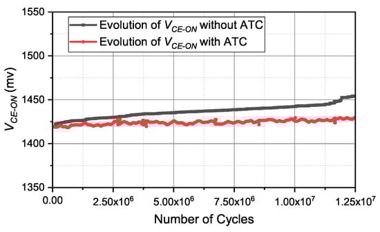 To further demonstrate the effectiveness of the proposed method, the realistic reliability improvements made by decreasing thermal damage are presented. Typically, the reliability performance of the IGBT module can be indicated by the evolution of on-state collector-emitter voltage . The evolution of can be realized using a power cycling test. The power cycling tests during the operation conditions with/without ATC are processed respectively, and the values of under these two test conditions are measured continuously. Then, the test results are obtained and are shown in Figure 17. Compared with the test results with ATC, the values of without ATC have a larger growth during the power cycling test, and the difference between the two voltage signals increases monotonously, meaning that the IGBT module without ATC has greater thermal damage. This phenomenon indicates that, in practical applications, the reliability performance of IGBT can be improved by the proposed ATC method.