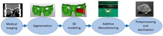 AM of implants is a multistep process [,], outlined in Figure 1. The first step entails medical image acquisition, commonly obtained using computerized tomography (CT) or magnetic resonance imaging (MRI) of the patient [,]. Next, a digital 3D reconstruction is generated and undergoes processing. During this stage, the internal and external geometries of the model can be modified, allowing for the inclusion of porous surfaces and for significant control over the weight and mechanical properties of the implant []. The model is then 3D printed into a physical product. There are several methods of 3D printing available for use, of which the most common include powder bed fusion (PBF), stereolithography (SLA), and fused deposition modeling (FDM).