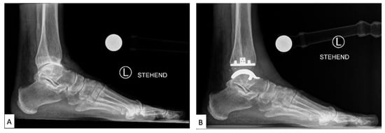 - Brigido, S.A.; DiDomenico, L.A. Primary Zimmer Trabecular Metal Total Ankle Replacement. In Primary and Revision Total Ankle Replacement; Roukis, T.S., Berlet, G.C., Bibbo, C., Hyer, C.F., Penner, M.J., Wünschel, M., Prissel, M.A., Eds.; Springer International Publishing: Cham, Switzerland, 2016; pp. 131–149. ISBN 978-3-319-24413-6. [Google Scholar]