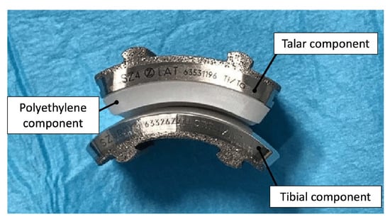 Second through fourth-generation TAA implants consist of three components: a metal component attached to the tibia, a metal component attached to the talus, and a mobile plastic implant between the two [,], as shown in Figure 4. Advancements in this design provided almost normal kinematic function of the joint in plantarflexion/dorsiflexion, inversion/eversion, and tibial rotation, resulting in overall improved gait performance as well as increased pain relief compared to AA outcomes [,]. Existing reviews have concluded that complication rates in patients with TAA (19.7%) in recent years have also been lower than in patients with AA (26.9%) []. However, complication and failure rates remain higher than those for knee and hip arthroplasties, still making TAA a controversial technique in clinical use. Revision rates following TAA have also been reported as high as 7.9%, compared to 5.4% for AA [], which has been largely attributed to the loosening of the implant.