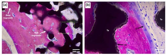 Light microscopy images of the talar/bone component stained with Sanderson’s rapid bone stain (SRBS) 3.5 years post-operation. Mineralized bone was stained pink, osteoid and non-mineralized soft tissue were stained blue, and the color black is for tantalum. (a) Low-magnification image of explants showing bony ingrowth into the porous tantalum implant, with healthy remodeling. (b) Higher-magnification view of the green dotted box in image (a) showing osseointegration to the porous tantalum with the patient’s newly formed bone. Ta: tantalum, O: osteoid, OI: osseointegration [].