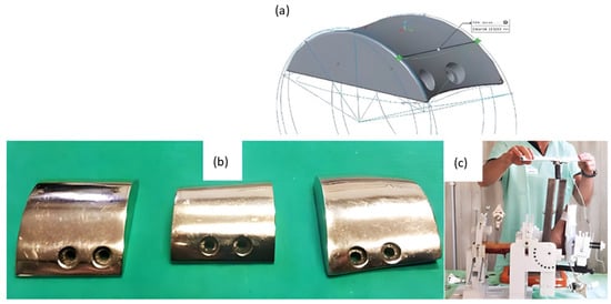 A group recently outlined their use of AM and testing of patient-specific TAA implants []. CT scans of the tibia, fibula, talus, and calcaneus bones of anatomical cadaver specimens were used to design computer models of the implant with matched curvature radius and external contouring of the bones (Figure 6). Selective Laser Melting (SLM) using cobalt–chromium–molybdenum powder (spherical, 15–45 µm) was then used to create near-full density implants for the two metal components of the implant. In vitro testing of the components implanted on corresponding cadaveric specimens was performed by applying loading/unloading cycles in three dimensions. Joint mobility and stability were tested through manipulation in dorsiflexion/plantarflexion.