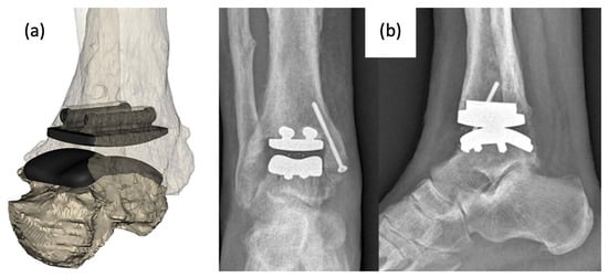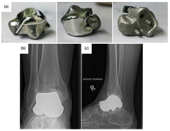 (a) 3D-printed third-generation total talus prosthesis and post-operative X-rays of implanted 3D-printed third-generation TTA prosthesis, (b) anterior–posterior, and (c) lateral views [,].