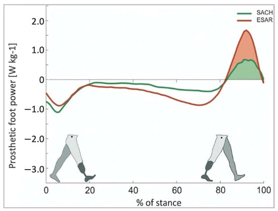 ESAR prosthetic feet generate greater energy, reduce metabolic costs, and increase self-selected walking speeds when compared to the conventional SACH foot []. A study comparing the ESAR foot to SACH feet demonstrated that the ESAR foot allowed for higher push-off power and increased intact step length without decreasing backward stability [] (Figure 12).
