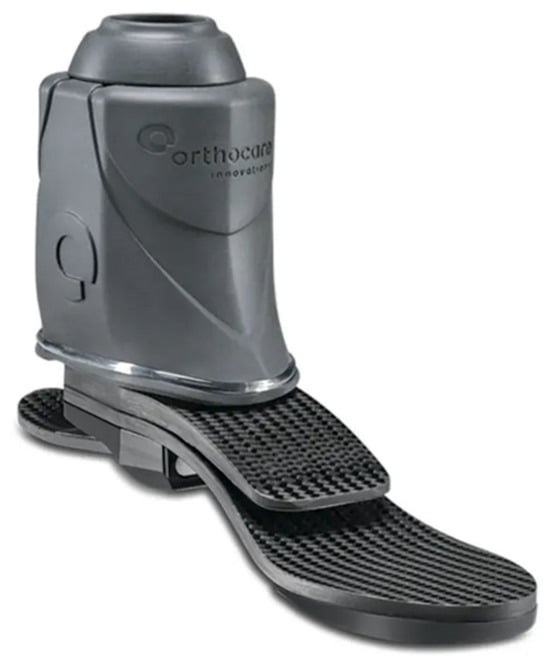Recent developments in powered ankle exoskeletons (PAEs) aim to reduce the energy expenditure of patients with lower extremity amputations and improve their quality of life []. PAEs utilize microprocessors, which are internal computers with sensors that relay information between the human body and the device. Microprocessor-controlled ankle–foot (MPF) systems were commercially introduced in 2006 with the goal of improving gait mechanics. The original MPF system, however, lacked the ability for powered plantarflexion. In more recent years, MPF prosthetic devices have been developed to more closely mimic physiological ankle function (Figure 13) [,]. MPFs have shown multiple advantages compared to non-microprocessor prosthetic feet, including improvement in biomechanical performance during climb of ramps and stairs, increased toe clearance during swing, reduced pressures against remaining limb within the socket, and increased mobility of the prosthetic []. Additionally, significant improvements in physical function scores were found in prosthesis users who transitioned from using non-MPFs to MPFs []. Common materials used in MPF ankle systems include carbon fiber and titanium.