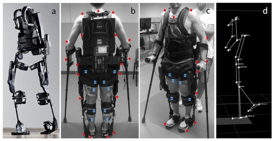 (a) Photograph of exoskeleton Ekso 1 equiped with 4 powered motors at the hips and knees, 2 powered joints at the hip and knee, and a semi-rigid unpowered ankle joint; (b,c) patient utilizing mobile ankle exoskeleton with the aid of crutches to maintain balancing. The system was equiped with motion analysis markers (red dots) and electromyographs (blue dots) for gait analyis; (d) kinematic data resulting from the motion capture system [].