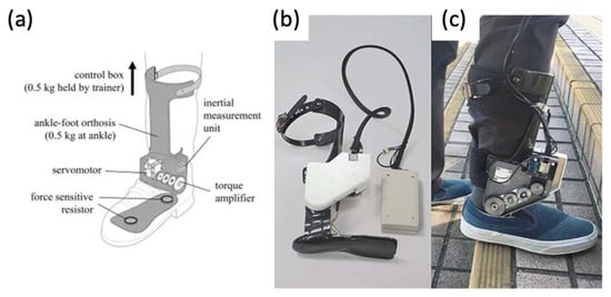 Powered exoskeletons are being applied in the gait rehabilitation of both chronic and sub-acute stroke patients [,]. One such model being used is a modified form of an ankle–foot orthotic coupled to a rotatory servomotor and torque amplifier that provides powered assistance in plantarflexion and dorsiflexion (Figure 16). The powered exoskeleton also contained force-sensitive resistors that could identify changes in gait phase and foot loading.