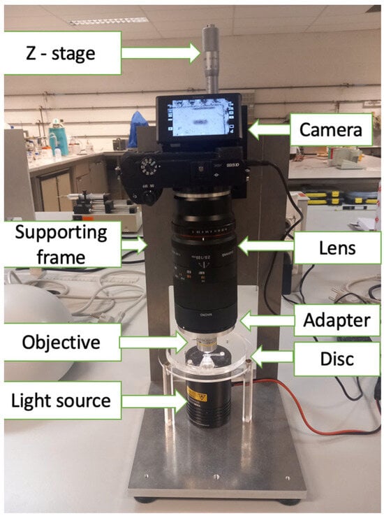 The imaging setup is shown in Figure 2. For the capture and storage of a single image for future examination, a Sony α6100 camera ( Sony Group Corporation, Minato, Tokyo, Japan) was used throughout the experiments. The camera was connected to a Samyang Macro lens 2.8/100 mm (Samyang Optics, Masan, South Korea). With the aid of an adaptor, the Macro lens was connected to an objective lens of 10× or 20× magnification power, depending on the experiments. To increase the visibility of the artificial parasite eggs (polystyrene particles) and the actual STH eggs in the LOD, the imaging setup was connected to a halogen light source (Quartz Tungsten-Halogen lamp, Thorlabs Inc., Newton, NJ, USA).