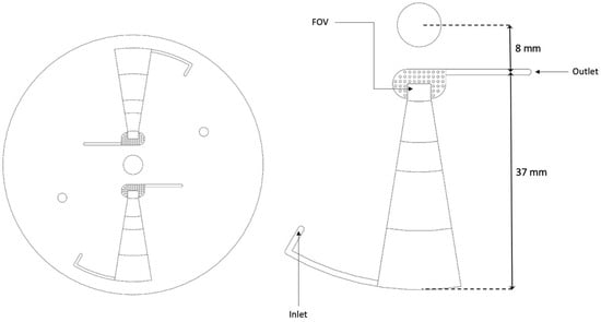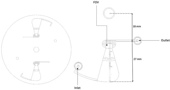 The newly designed short-chamber LOD (Figure 3) produced from Poly (Methyl Methacrylate) (PMMA) plastic possesses a shorter convergence chamber of 27 mm in length with a width and depth that decrease in size from the periphery toward the rectangular section (collection zone/FOV). The chamber has a curved corner facing the sample entrance channel, and the length from the chamber to the center of the disc is 18 mm. The long-chamber LOD (Figure 4) was also produced from PMMA and fabricated in such a way that it possesses a longer convergence chamber of 37 mm in length with a width and depth that decrease from the periphery towards the rectangular section (collection zone/FOV). Also, the chamber has an angled corner opposite the sample entrance channel. The distance from the chamber to the center of the disc is 8 mm.