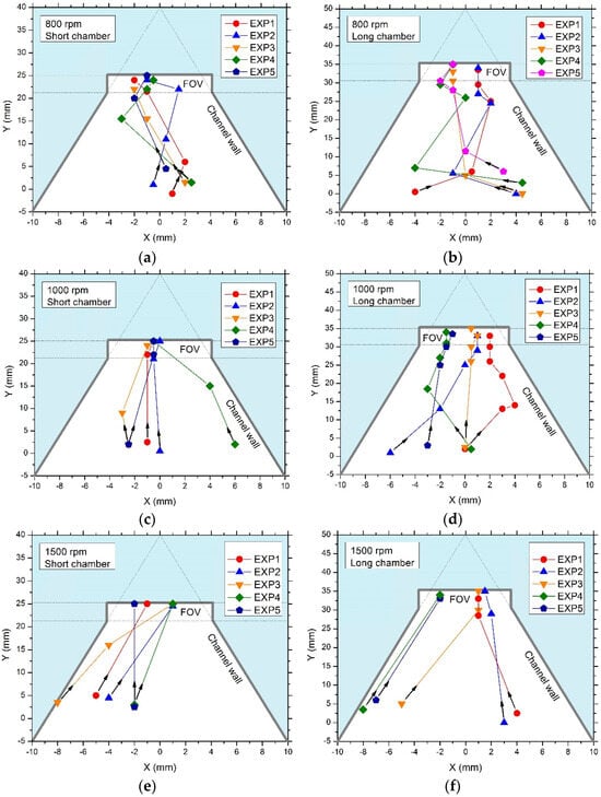 At a rotation speed of 1500 rpm, 80% of the PS particles (EXP 1, EXP 2, EXP 4, and EXP 5) in the short-chamber LOD device (Figure 6e) reached the FOV without undergoing zig-zag parts in their trajectories, whereas with the same rotation speed, in the long-chamber LOD device, only 40% (EXP 1 and EXP 2) managed to reach the FOV without undergoing zig-zag trajectories (Figure 6f). This result indicates that in the long-chamber LOD device, the Euler and Coriolis forces exerted on the particles are strong enough to cause the zig-zag patterns in the trajectories of the moving PS particles even when the rotation speed is 1500 rpm (see Figure 6e,f).