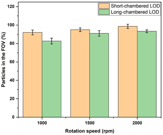 So far, 2000 rpm was the rotation speed with the highest yield in both the short-chamber and long-chamber LOD devices. However, the short-chamber LOD device was superior to the long-chamber LOD, since it allowed the delivery of 98.67 ± 2.31% of the PS particles to the FOV.