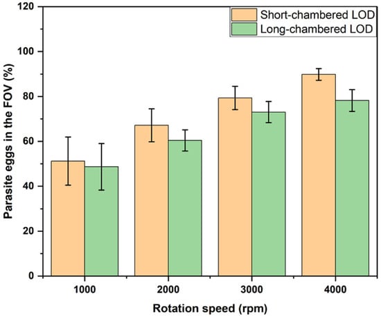 The results of this experiment are, in general, in good agreement with those described above for PS particles, indicating that the model system fairly reproduced the properties of real parasite eggs. As in the case of PS particles, the higher the rotation speed, the higher the fraction of the eggs delivered to the FOV. Also, the short-chamber LOD device showed a higher efficiency in delivering eggs to the FOV as compared to the long-chamber LOD. The results for the short-chamber LOD vs. the long-chamber LOD, for different rotation speeds of 1000 rpm, 2000 rpm, 3000 rpm, and 4000 rpm, are summarized in Table 2. Since we used the same flotation solution (density: 1.175 g/mL) for both systems—PS particles (density: 1.05 g/mL) and STH eggs (density: 1.15 g/mL)—the density contrast for STH eggs was lower than that for PS particles, requiring a higher rotation speed to achieve the same output, i.e., the fraction of the eggs delivered to the FOV. Therefore, the rotation speed was increased to 4000 rpm in the experiments with STH eggs. The fractions of STH eggs delivered to the FOV for the short-chamber and long-chamber LODs, for the rotation speeds of 2000 rpm, 3000 rpm, and 4000 rpm, are shown in Figure 8 as the average (over four different experiments) fractions of STH eggs delivered to the FOV for the short-chamber and long-chamber LODs. As shown in Figure 8, the fraction of STH eggs delivered to the FOV gradually increased with the rotation speed for both the LOD devices, from about 50% at 1000 rpm to about 90% for the short-chamber LOD and about 80% for the long-chamber LOD at 4000 rpm. For all the rotation speed values, the efficiency in delivering STH eggs to the FOV for the short-chamber LOD was superior to that for the long-chamber LOD device.