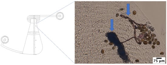 The revealed unusual motion patterns represent undesirable effects that can prevent some parasite eggs from reaching the FOV of the LOD device, thus limiting its efficiency. Since the density of parasite eggs is lower than that of the solvent, they move towards the center of rotation during centrifugation. It is worth noting that the revealed behavior occurs mainly near the center of rotation where the centrifugal force is small, and the interplay of the tangential Euler and Coriolis forces and the interaction with the walls could cause the backward motion []. Therefore, the undesirable effects occur near the entrance to the FOV, as confirmed by the experimental observations. In addition, the channel has a smooth step near the entrance to the FOV [,], which can trap some eggs before they reach the FOV considering the strong decrease in the centrifugal force near the entrance to the FOV, as compared to its values in the rest of the channel.