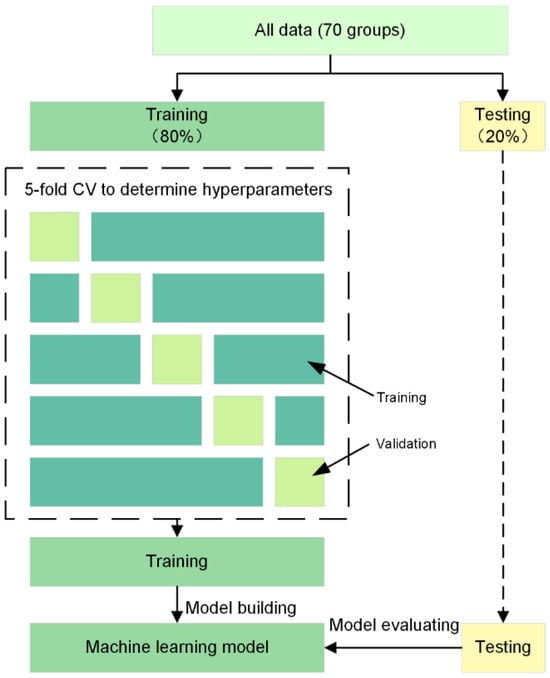We employed five different machine learning methods, namely, SVR, BPNN, DT, RF, and KNN, for prediction. For training and testing, we used a dataset containing 70 groups of data, with 20% of the data used as the test set to evaluate the accuracy of the model’s prediction of unknown data. Given the limited size of the dataset, to obtain more reliable results, we adopted a 5-fold cross-validation strategy to ascertain the optimal hyperparameters for each model. During each calculation, four subsets were utilized for training the model, while the remaining subset was reserved for validation purposes. Hyperparameters with the smallest average root mean square error (RMSE) were chosen as the best ones and were selected for model training. This process is shown in Figure 1. All machine learning algorithms were implemented using Jupyter Notebook 6.5.4, Python version 3.8.12, and were constructed using the scikit-learning package. Given the disparate value ranges of the input variables, a standardization procedure was employed to mitigate the potential influence of these variations on the model outcomes. We standardized the four input parameters by adjusting the data to a distribution with a mean of 0 and a variance of 1. This approach was adopted to promote a balanced impact of distinct variables on the model. The calculation formula is provided below: