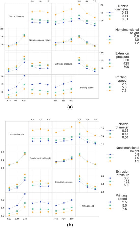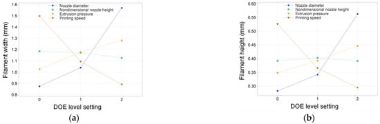 (a) Interaction plots of the filament width and (b) interaction plots of the filament height.