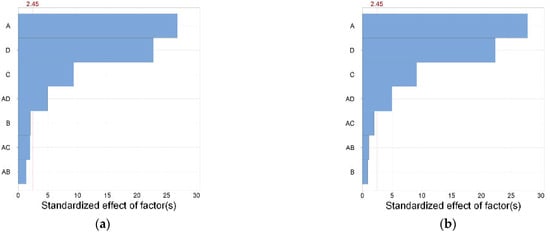 Pareto chart of the standardized effect of the (a) filament width and (b) filament height.