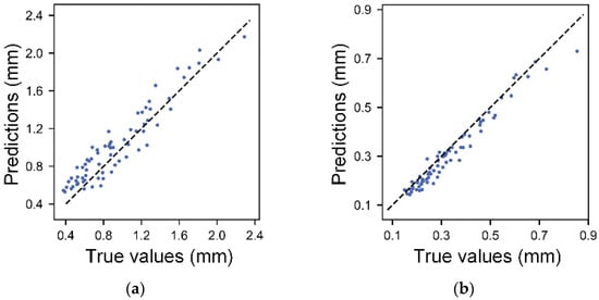The coefficient of determination R2 for the filament width and height are 0.8996 and 0.9641. Figure 5 illustrates the relationship between the predicted values of the regression equation and the true values. The data points that closely align with the dashed line indicate a strong agreement between the predicted and actual values. Obviously, the prediction accuracy for the filament height is notably higher, which aligns cohesively with the coefficient of determination outcomes. These polynomial regression models offer a more comprehensive perspective on the influence of the printing parameters over the filament width and height. This mathematical representation aids in achieving a deeper comprehension of this intricate relationship.