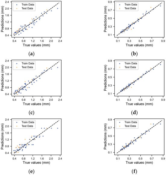 After determining the hyperparameters, the machine learning models were trained, and both the training data and test data were predicted by the models. We calculated the RMSE, MAE, and R2, as shown in Table 4 and Table 5. For the prediction of filament width, the R2 of the five different algorithms on the test dataset ranged from 0.7734 to 0.9025, while the R2 of the filament height prediction ranged from 0.9205 to 0.9604. It is evident that the prediction accuracy of the filament height outperforms that of the filament width. We then made some comparisons to previously reported studies. Ali et al. [] predicted the tensile strength and flexural strength of 3D-printed concrete materials by four machine learning methods, with R2 values ranging from 0.7253 to 0.8785. Wang et al. [] predicted the drug loading efficiency of 3D-printed drugs in relation to material and process parameters, with R2 values ranging from 0.678 to 0.93. In contrast, the model established in this article has a similar performance for filament width prediction, while it performs more accurately with filament height prediction.