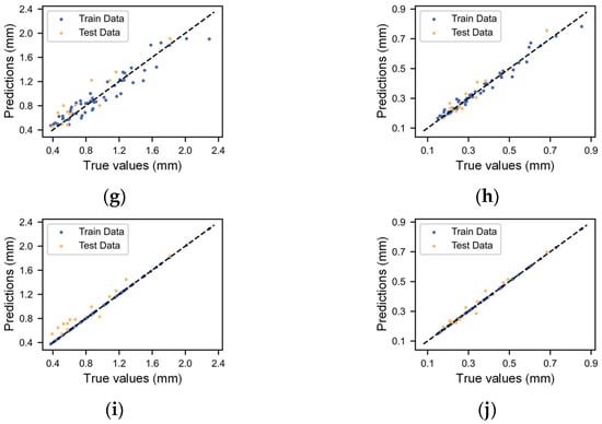 Scatter plots of the predicted values calculated by the different machine learning models versus the true values: (a) SVR width, (b) SVR height, (c) BP NN width, (d) BP NN height, (e) DT width, (f) DT height, (g) RF width, (h) RF height, (i) KNN width, and (j) KNN height.