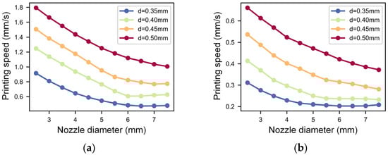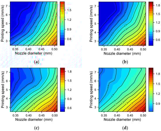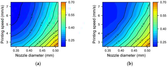 Contour map of the filament width with different nozzle diameters and printing speeds under different nondimensional nozzle heights: (a) nondimensional nozzle height of 0.85 and (b) nondimensional nozzle height of 1.15.