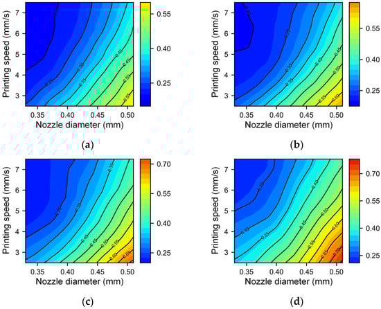 Contour map of the filament width with different nozzle diameters and printing speeds under different extrusion pressures: (a) 360 kPa, (b) 400 kPa, (c) 440 kPa, and (d) 480 kPa.