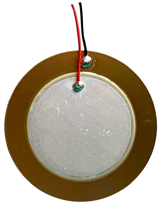 The Murata “7BB-35-3L0” (Figure 1) is a lightweight, ultra-thin ( mm), and circular piezoelectric diaphragm. It is based on the piezoelectric effect, and it is widely used in applications where contact is a requirement. Such types of sensors have already been applied in the detection of murmurs [38].