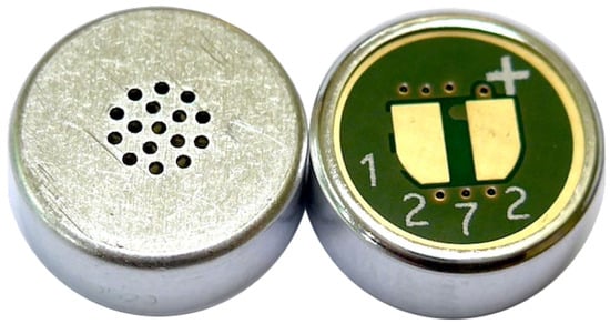 The EM272Z1 (Figure 2) is an omnidirectional microphone capsule with solder pads for two wires connection. It is based on a field effect transistor and an electret (crasis of ‘electricity’ and ‘magnet’), a dielectric material with a permanent dipole polarisation removing the need for a polarizing power supply. This microphone is characterized by an SNR of 80 dB, −28 ± 3 dB, and a maximum input sound pressure level of 119 dB. The manufacturer recommends their mic for recording natural sounds, backgrounds, and ambiance, thanks to the low noise and high sensitivity characteristics.