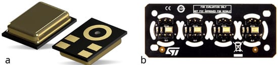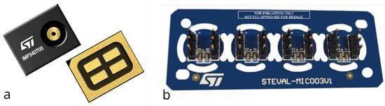 The MP23ABS1 (Figure 3a) by STMicroelectronics is a low-power (maximum 150 μA) and compact device (3.5 × 2.65 × 0.98 mm) with a 64 dB SNR, an omnidirectional sensitivity of −38 ± 1 dBV (at 94 dBSPL, 1 KHz), a 130 dBSPL AOP, and a flat frequency response of up to 15 KHz. This device comes with a metal casing to improve product robustness and reliability. Moreover, the substrate embeds capacitance plating to enhance RF immunity, and the base is provided with a sound pickup hole. Applications for this microphone include wearables, hearables, and smart speakers.