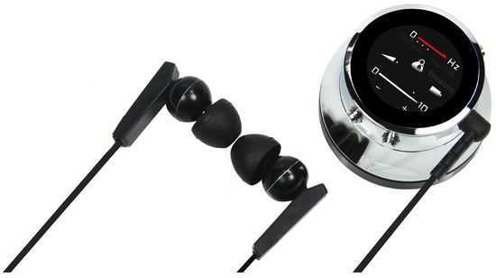 Thinklabs One [26] (Figure 5) is a digital stethoscope that features multiple filter choices and can be used to acquire sounds from the heart, lungs, and other parts of the body. Unlike traditional devices, the electronic amplification of sound is regulated through volume control. The volume and filtering controls can be used via buttons located on the device itself. The user can auscultate body sounds via external earphones or record via a device with an onboard device (laptop, smartphone, etc.) connected via a mm audio jack to the device.