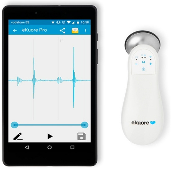 eKuore (Figure 6) is a stethoscope that exploits a Wi-Fi connection to communicate with any smartphone or tablet via a free dedicated app. On those devices, the phono-cardiograms of the heart and lungs can be recorded and viewed in real time or shared with remote users. In addition, the auscultations can be performed using a headphone set, thanks to the device’s mm jack connector.
