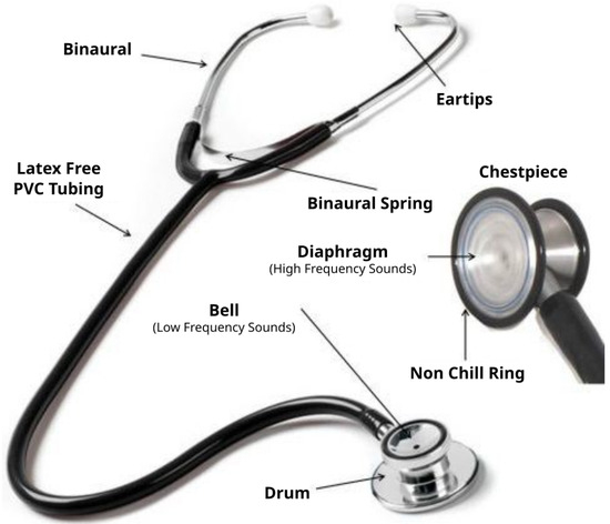 - Stethoscopesweb. What Are The Parts Of A Stethoscope. 2023. Available online: https://www.excel-medical.com/what-are-the-parts-of-a-stethoscope/ (accessed on 30 January 2023).