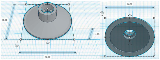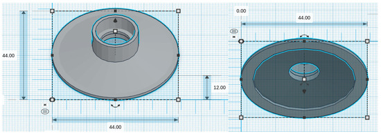 We considered five chestpiece models for the four microphones: for the piezoelectric diaphragm, a single-size drum (Figure 8, inspired by [39]) was realized; for the electret condenser and MEMS solutions, two chestpieces were developed (based on stethoscope’s chestpiece parts and [39]), with the difference being the small (Figure 9 and Figure 10) or large (Figure 11 and Figure 12) dimensions. The piezo diaphragm size was fixed, so it was not possible to have two different cups for it, whereas, for the other solutions, two different cup sizes were analyzed in order to test the different frequency responses, akin to the bell and diaphragm parts of the chestpiece.