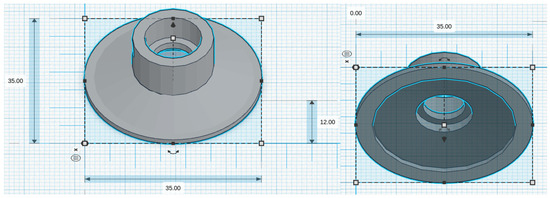All the cups were 3D-printed with a PLA (polylactic acid) plastic filament. In the following pictures, the designs obtained using the web app for 3D design Thinkercad [41] are depicted. The cups’ dimensions are suitable to host the diaphragm plastic disc. More specifically, the “3M™ Littmann® Stethoscope Spare Parts Kit Classic III™ Cardiology IV™ and CORE, 40,016, Black, 10 Kit/Case” [42] was purchased, a kit with two plastic diaphragms suitable for the various cups and for the large and small sizes. Regarding the insertion of the respective sensor inside the cups, a circular constriction can be observed. For the piezoelectric solution, this constriction is visible only from the bottom view, approximately halfway up the chamber. For the other solutions, it can be noticed from both the top and bottom views at the beginning of the conical chamber. The sensor is placed and attached at this point to ensure an airtight seal, preventing any air leaks and allowing the full pressure of the air chamber below to act on the microphone sensor.