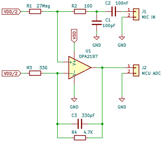 In this work, a signal conditioning circuit for analog microphones tuned to chest sound frequencies is reported. The focus will be precisely on choosing the best microphone technology for the auscultation practice. In the literature, there are many examples of microphone technologies being compared [8,9] in a large number of applications, including human body auscultation [10,11]. Nevertheless, the work on contact mics is quite old [10,12], and these works do not take advantage of the advancements in MEMS mic manufacturing technologies [11]. Regarding the practical usage of MEMS microphones in digital auscultation, some preliminary evaluations have been conducted [13,14], and a few auscultation devices have been presented [15,16], but there is a lack of comparison studies among the different microphone technologies.